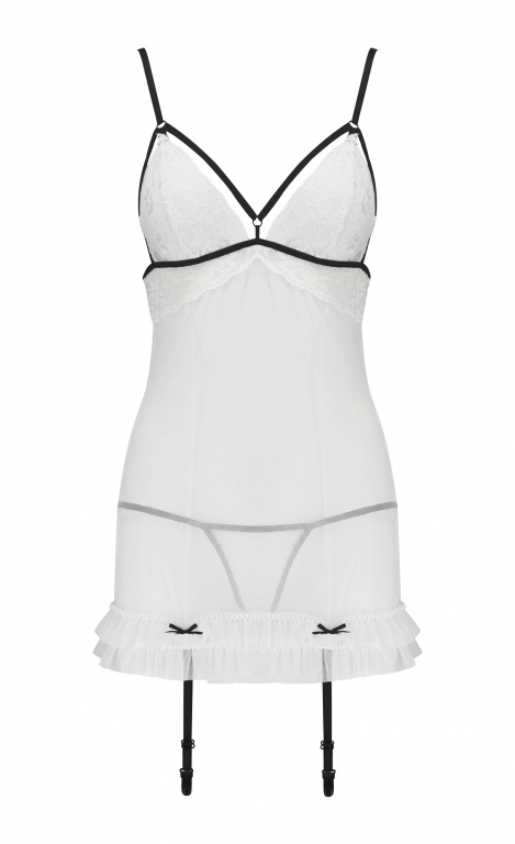 Эротическая сорочка белого цвета с подвязками для чулок, выполнена из полупрозрачного тюля и эластичного кружева!