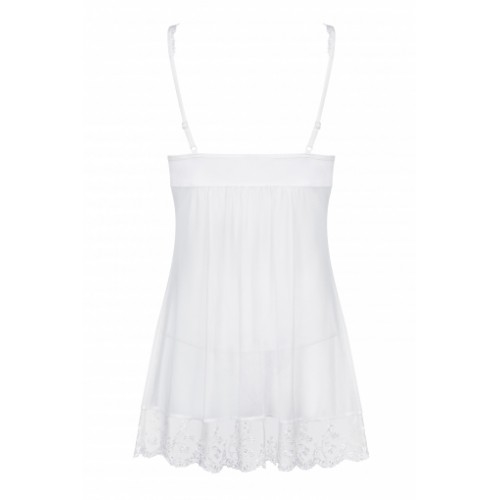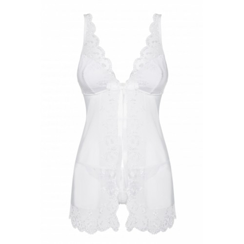 Бретели и полы сорочки украшены вышивкой с цветочным рисунком, чашка мягкая без косточки, зону декольте дополняют атласные ленты, завязывающиеся в бант. В комплект входят трусики стринги, украшенные вышивкой.