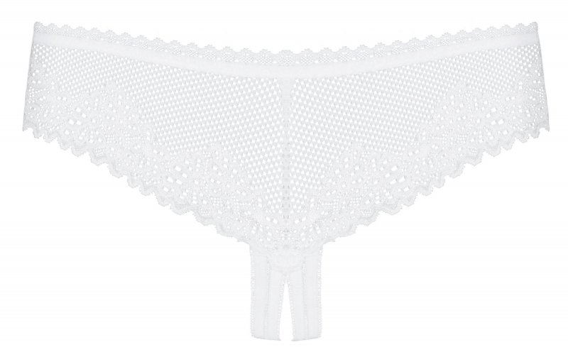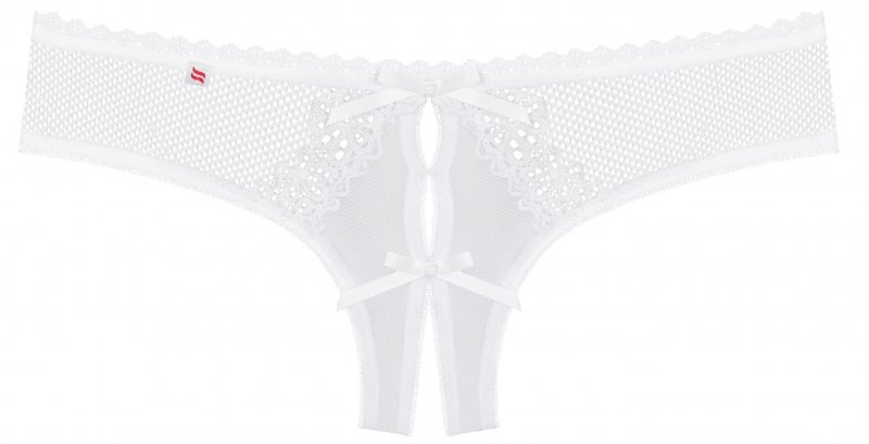 Детали: кружевные стринги с пикантной открытой промежностью, соблазнительные вырезы, украшенные бантиками спереди, эластичная, идеально прилегающая к телу ткань.