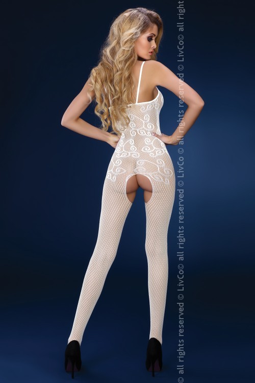 Верх украшен кружевом и легким ненавязчивым рисунком, нижняя часть же состоит из мелкой сетки. Имеется каплевидный вырез на области живота, по краям отделан кружевом, на груди есть атласный бант.