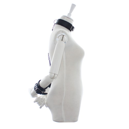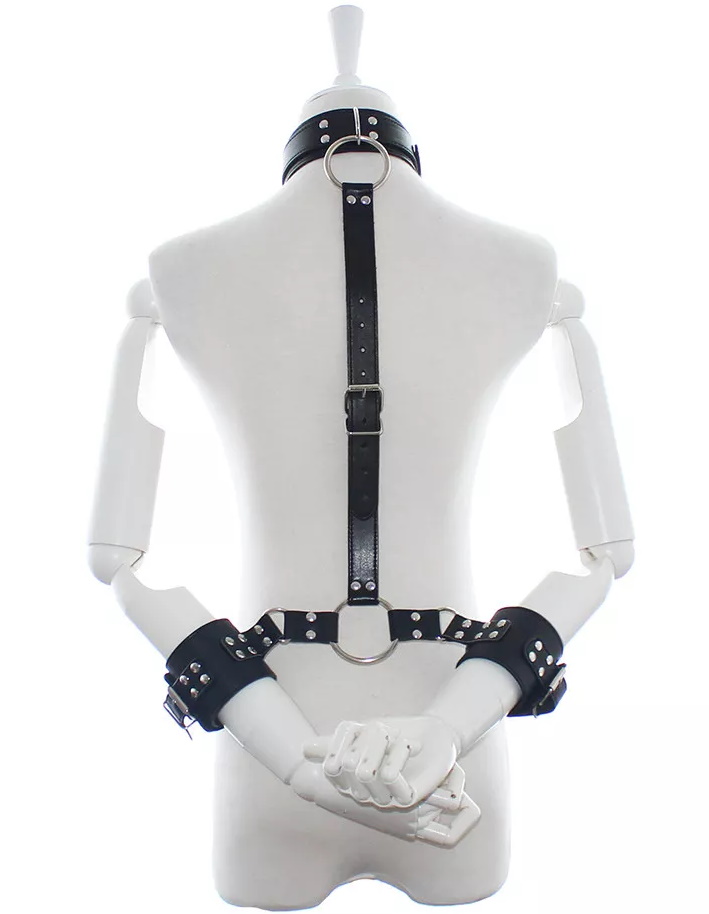 Бондажный ремень совмещён с ошейником и фиксаторами для рук и прекрасно подойдёт как начинающим, так и опытным практикам субкультуры БДСМ.