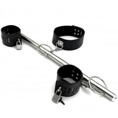 Выполненная из металла серебристого цвета, распорка оснащена креплениями для оков. Наручники и ошейник из искусственной кожи надежно крепятся к распорке, и фиксируются на запястьях и шее.