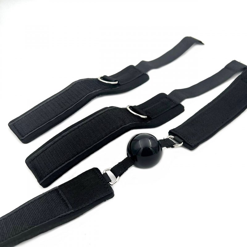 Бондаж состоит из наручников, застегивающихся на липучки, ошейника с кляпом и соединительной фиксации, которая регулируется по длине.