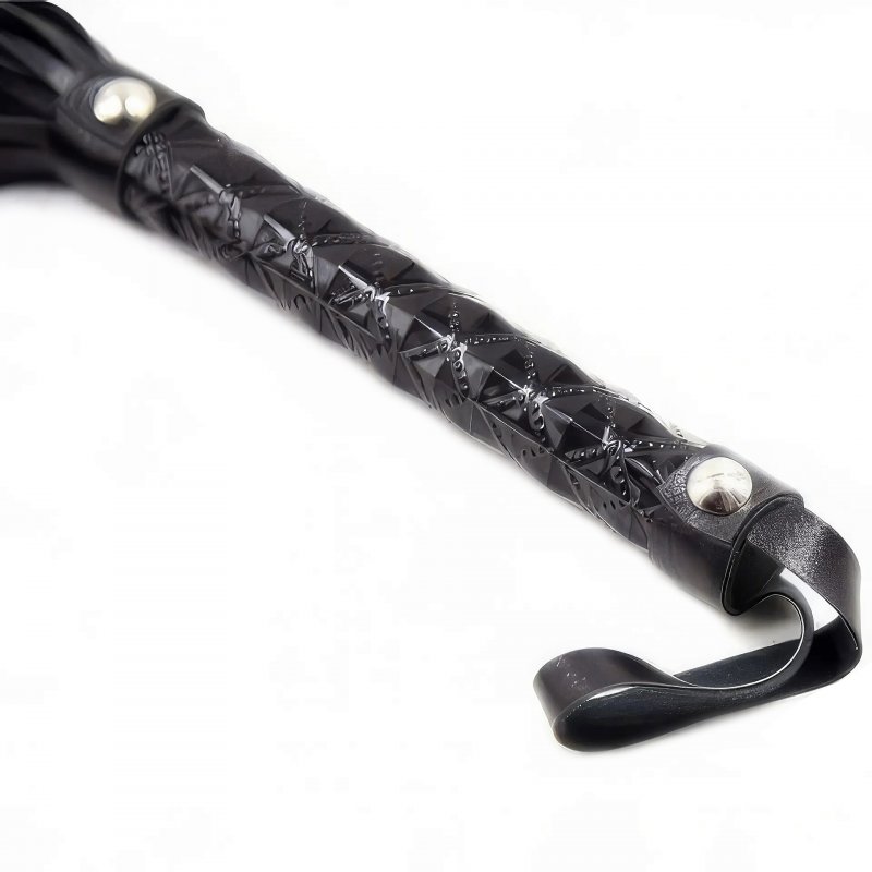 Ручка украшена лакированным узором, на конце имеется петелька для того, чтобы плеть удобно лежала в руке во время игр.
