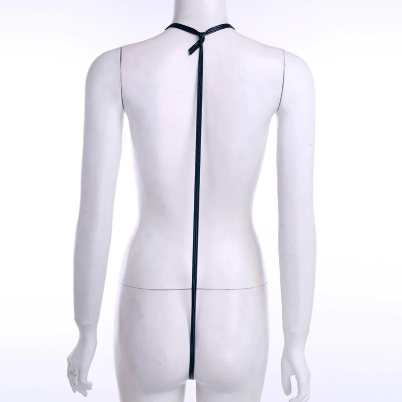 Оно имеет вырез на шее, открытый бюст и глубокий V-образный вырез спереди, создавая чувственный и эффектный образ. С открытой спиной и без косточек, это белье обеспечивает комфорт и свободу движений. Завязки сзади на шее добавляют эротичности и романтики.