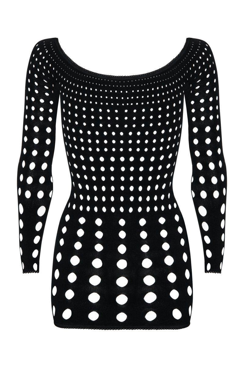 Детали: бесшовный материал, очень приятный на ощупь, заманчивые "глазки" по всему платью, кокетливый, глубокий вырез, спускающийся до плеч, длинный рукав, очень мягкая и эластичная ткань.