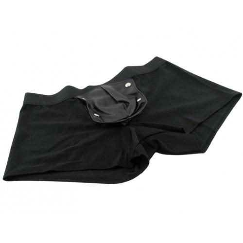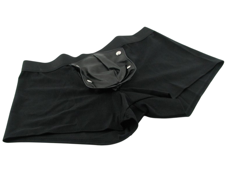 Гульфик из эко-кожи полностью отстегивается при помощи кнопок, поэтому половой акт можно начать, не снимая их. Также он дополнен вшитым эластичным эрекционным кольцом. Диаметр кольца 4 см. Сзади это классические трусы, полностью скрывающие ягодицы.