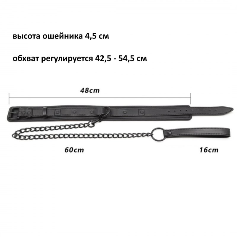 Размер: длина ошейника с ремешком 58 см., ширина ошейника 4,5 см., обхват по шее регулируется от 42,5 до 54,5 см., длина поводка c петлей 79 см., длина петли с кольцом 19,5 см