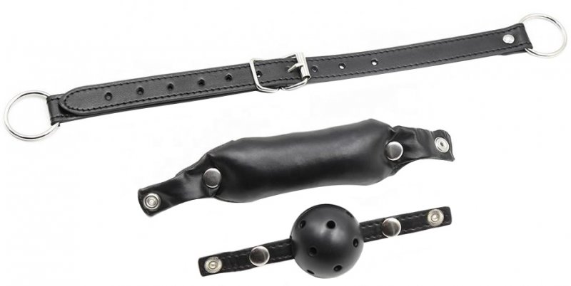 Ремешок кляпа имеет универсальный размер, который удобно регулируется при помощи пряжки. Такой аксессуар имеет две сменные насадки, которые представляют собой кляп-шар и кляп-трензель, и крепятся заклепками к ремню.