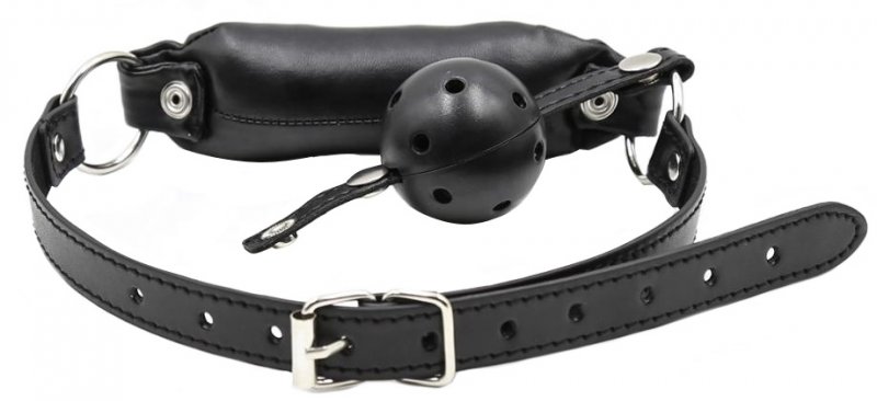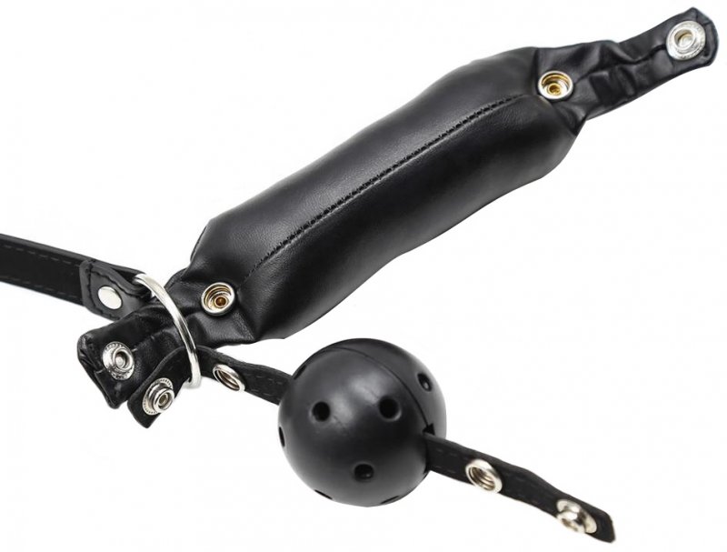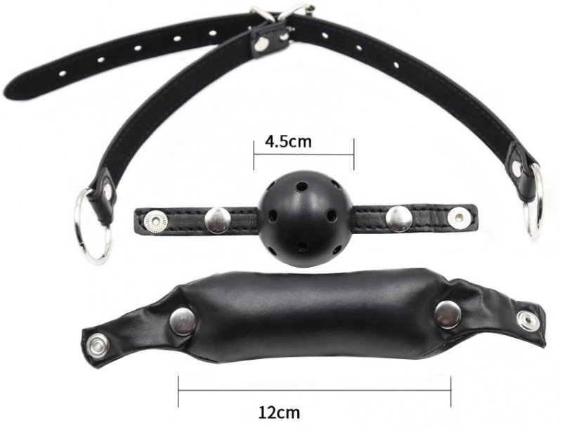 Кляп-шар выполнен из пластика и имеет дырочки для облегчения дыхания. Трензель невозможно выплюнуть, он надежно фиксируется при помощи ремешка, при этом удобен для использования.