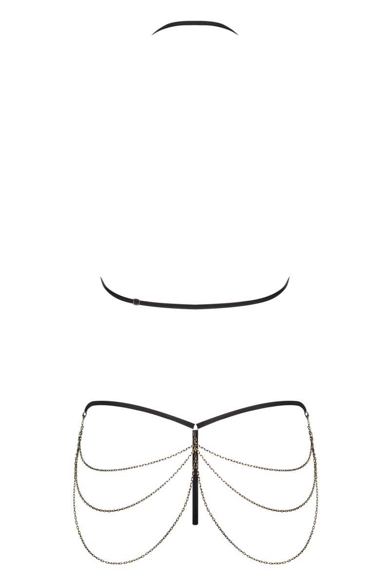 В комплект входят бюстгальтер, стринги и декоративные цепочки.