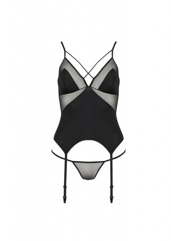 Черный корсет Quella из эластичного атласного материала и прозрачной микросетки, декорированный стрэпами в зоне декольте.