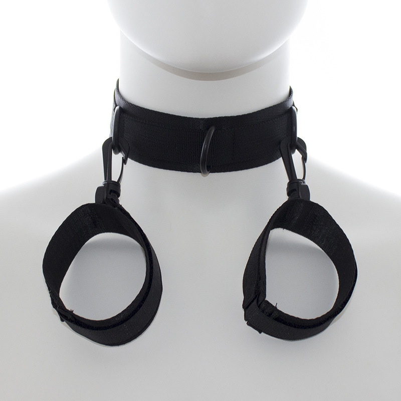 Выполненный из черного нейлона аксессуар надежно фиксируется на шее и запястьях с помощью липучки. Фиксатор не натирает нежную кожу и комфортно ощущается на теле.