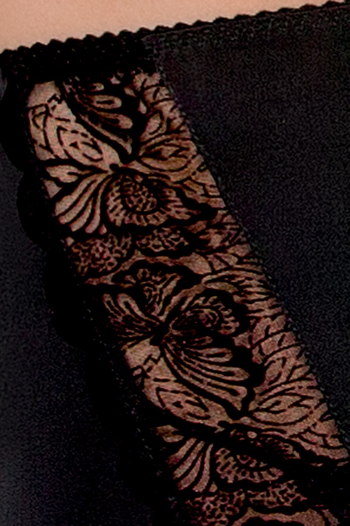 Комплект выполнен из испанской черной микрофибры и элегантного цветочного кружева украшает бюстгальтер и широкий пояс для чулок, придавая вашему образу загадочности.