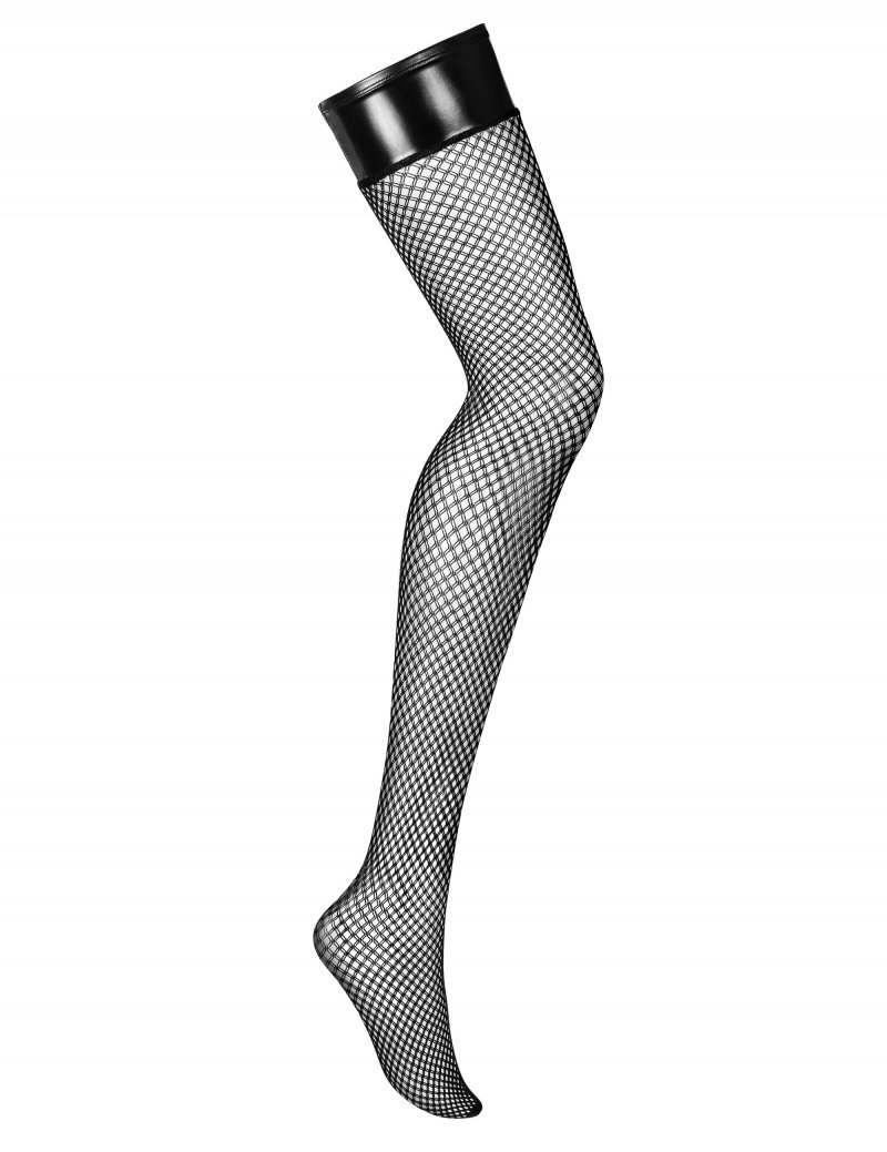 Чулки выполнены из черной сетки плотного плетения. На бедрах вставки из гладкого блестящего материала.