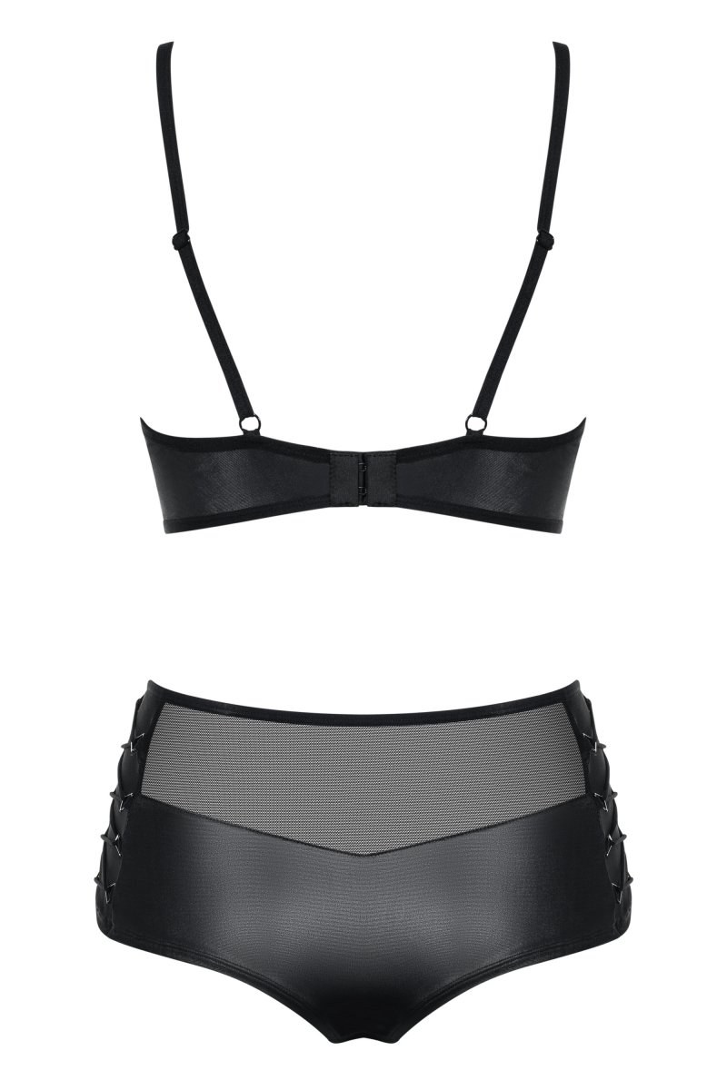 Детали: регулируемые бретельки и многоступенчатая застежка - идеальная посадка и комфорт, декоративные, эффектные полоски на груди, соединяющие бретели с бюстгальтером и визуально подчеркивающие бюст, усиленные косточками чашки бюстгальтера придают груди красивую форму, соблазнительный треугольный вырез под бюстом, трусики-шортики с полупрозрачной сеткой, эластичная шнуровка по бокам трусиков, эластичная ткань Multistretch.