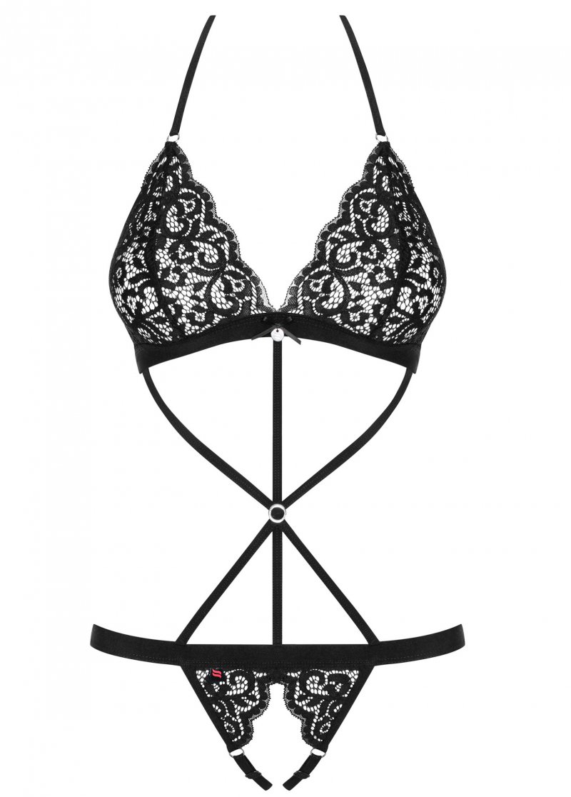 Детали: пикантное боди из черного кружева и эластичных лент, сочетание бюстгальтера и трусиков, сексуальная шнуровка на шее (открытая спина!), многоступенчатая застежка - идеальная посадка, открытая промежность, украшения в виде блестящих круглых элементов и бантов, эластичная ткань, адаптирующаяся к телу.