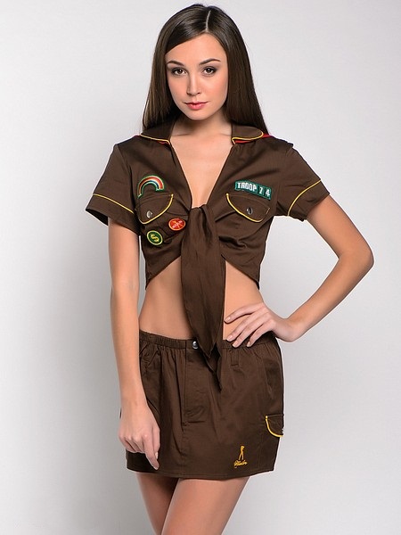 Соблазнительный ролевой костюмчик бойскаута для девушек. Мини-юбочка защитного цвета на бедрах застегивается на пуговицу и молнию.