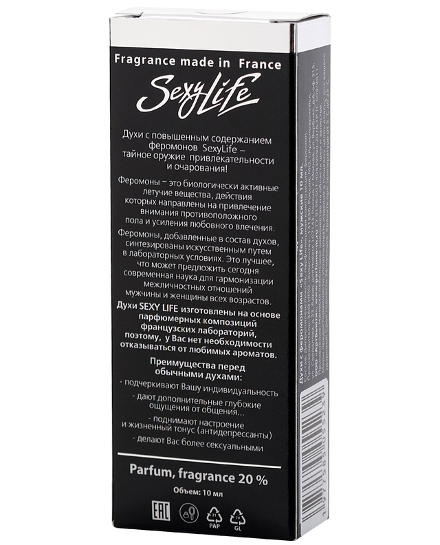 Духи с феромонами Sexy Life – безспиртовые (на масляной основе) ароматические композиции, в состав которых добавлены феромоны - уникальное средство для привлечения внимания противоположного пола и усиления любовного влечения.