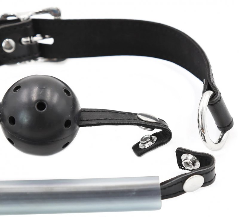 Ремешок кляпа имеет универсальный размер, который удобно регулируется при помощи пряжки. Такой аксессуар имеет две сменные насадки, которые представляют собой кляп-шар и кляп-трензель, и крепятся заклепками к ремню.