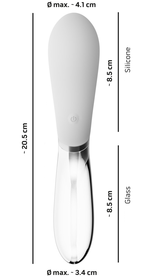 Размеры: общая длина 20,5 см, длина силиконовой части 8,5 см, длина стеклянной части 8,5 см, диаметр силиконовой части 4,1 см, диаметр стеклянной части 3,4 см