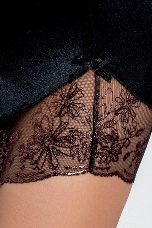Элегантная сорочка Brida выполнена из эластичного блестящего атласа, отделана нежной вышивкой с медным блеском, на регулируемых бретелях.