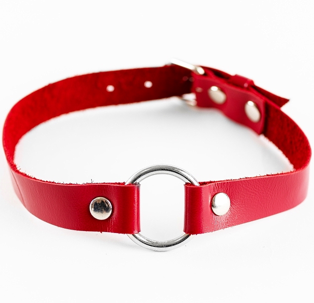 Элегантный чокер из натуральной кожи красного цвета, декорированный металлическим кольцом диаметром 3 см.