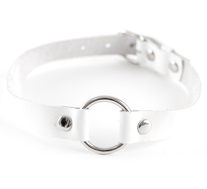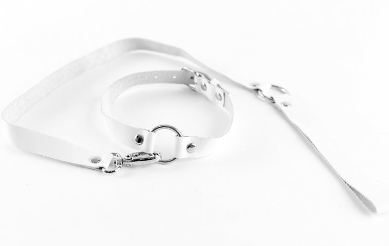 Элегантный чокер с поводком, выполненные из натуральной кожи белого цвета, декорированные металлическими кольцами диаметром 3 см.