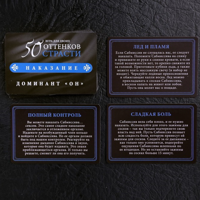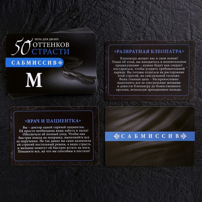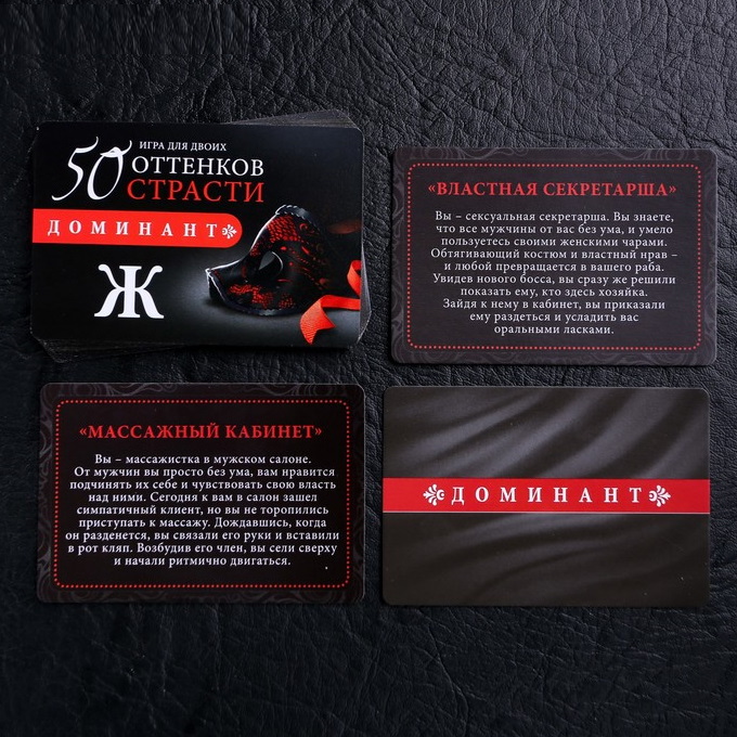 Вытягивайте карточки из соответствующих колод и воплощайте все фантазии в жизнь, а испытать наивысшее наслаждение от игры вам помогут горячие аксессуары.