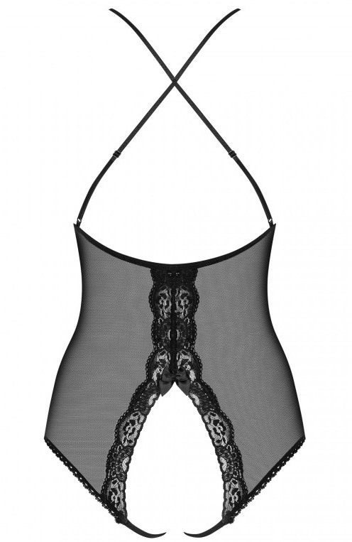 Детали: пикантное боди из прозрачной сетки и украшающего тело кружева, регулируемые бретельки, перекрещенные на спине - для идеальной посадки и сексуального образа, мягкие чашки - слегка приподнятая, красиво подчеркнутая грудь, ювелирные вставки, игривые бантики - спереди и ... над обнаженными ягодицами, открытая промежность с регулируемыми бретелями, приятные на ощупь, эластичные и идеально облегающие ткани.