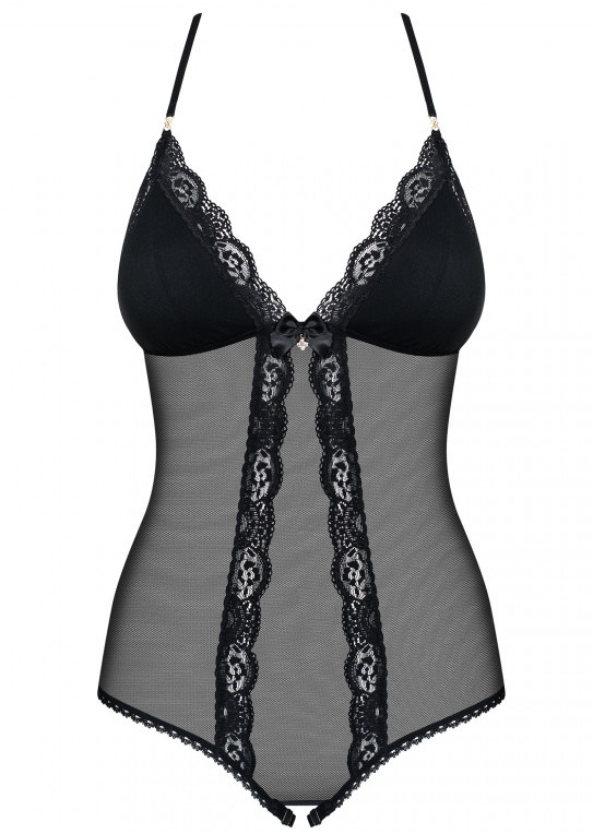 Детали: пикантное боди из прозрачной сетки и украшающего тело кружева, регулируемые бретельки, перекрещенные на спине - для идеальной посадки и сексуального образа, мягкие чашки - слегка приподнятая, красиво подчеркнутая грудь, ювелирные вставки, игривые бантики - спереди и ... над обнаженными ягодицами, открытая промежность с регулируемыми бретелями, приятные на ощупь, эластичные и идеально облегающие ткани.
