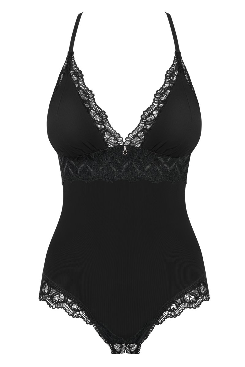 Детали: черное боди из мягкого материала, регулируемые бретельки на спине, кружевная окантовка в области груди - феноменально подчеркнутый бюст, красивое украшение на бюсте, кружевная вставка под грудью - супер женственный штрих, нижние края обработаны кружевом - аппетитно выделяют бедра, открытая промежность, очень приятная и идеально эластичная ткань Multistretch.