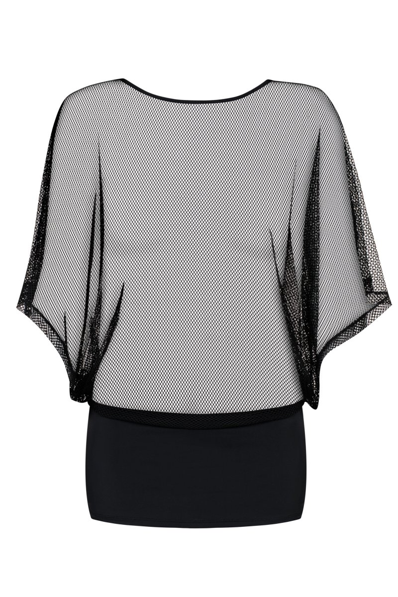 Платье представляет собой сочетание прозрачного сетчатого топа со свободными рукавами и мини-юбочки из плотной эластичной ткани.