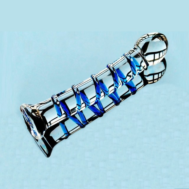Не реалистичный фаллоимитатор выполнен из прозрачного ударопрочного стекла, а ствол по всей длине охватывает ярко-синяя стеклянная спираль.