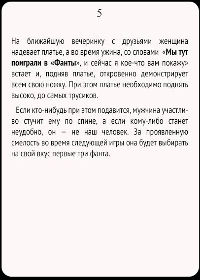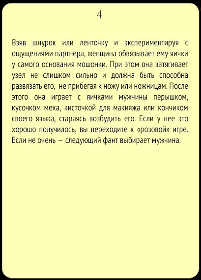 Сначала вы тянете белые, довольно невинные, карточки с заданиями, потихоньку входя во вкус. Затем наступает очередь желтых фантов — чуть более откровенных. И, наконец, когда вы уже довольно раскрепощены, пора переходить к розовым заданиям, которые уже предлагают много интересных занятий для пары.