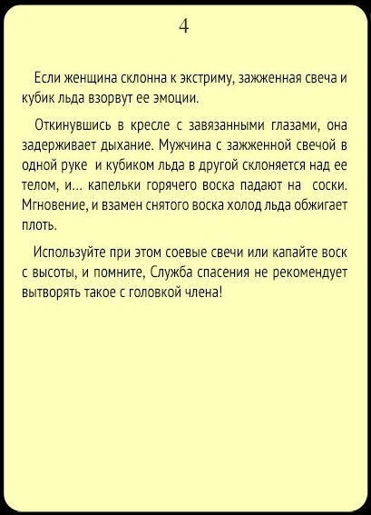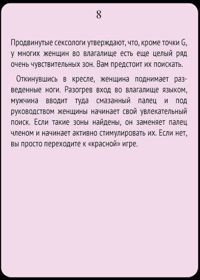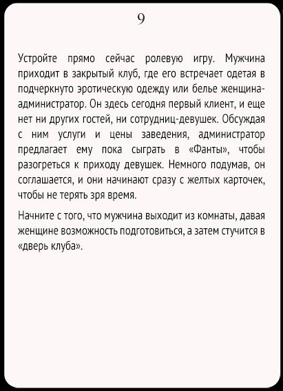 -увлекается РАЗНООБРАЗИЕМ ПОЗ и поиском нестандартного; -любит настоящие СЕКС-МАРАФОНЫ; -хочет попробовать новые РОЛЕВЫЕ ИГРЫ; -ТВОРЧЕСКИ подходит к интимным отношениям. В небольшой коробочке — почти полсотни приятных заданий. Начните с самых «невинных», белых, фантов. А когда почувствуете, что в комнате стало жарко, перейдите к следующей, уже более порочной, желтой колоде. Не торопитесь сразу взяться за розовые и красные фанты: чем длиннее прелюдия, тем ярче будет кульминация.