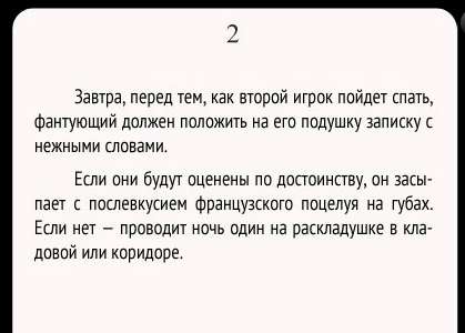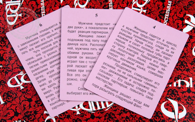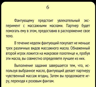 Разжигать дальше любовные страсти призваны жёлтые и розовые фанты. Здесь уже нужно проявлять ласку и нежность к партнёру, а может статься, что и начать весёлую ролевую игру. В финале игры, задания приводят к красному фанту, который познакомит игроков с интересными позами и принесёт самые яркие сексуальные впечатления. Все задания содержат подробные описания по организации и проведению игры, а также рекомендации по применению аксессуаров для секса.
