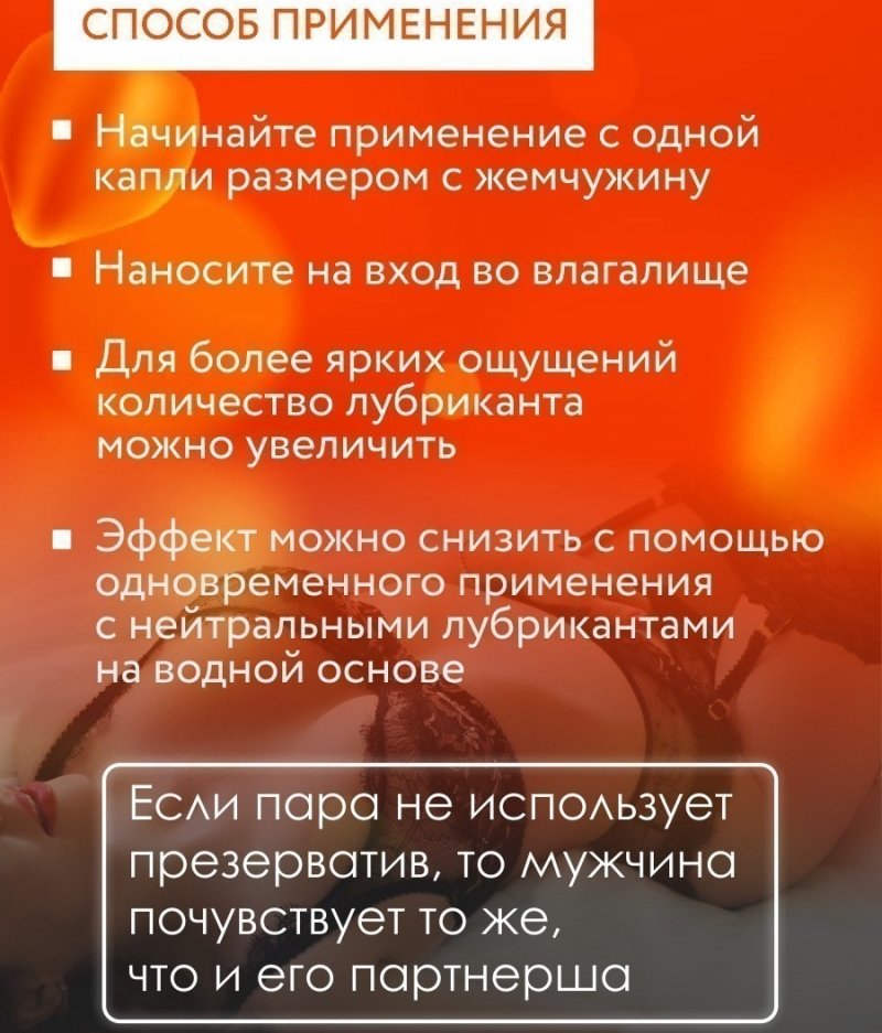 После нанесения дарит яркое ощущение тепла, переходящее в возбуждающую вибрацию.