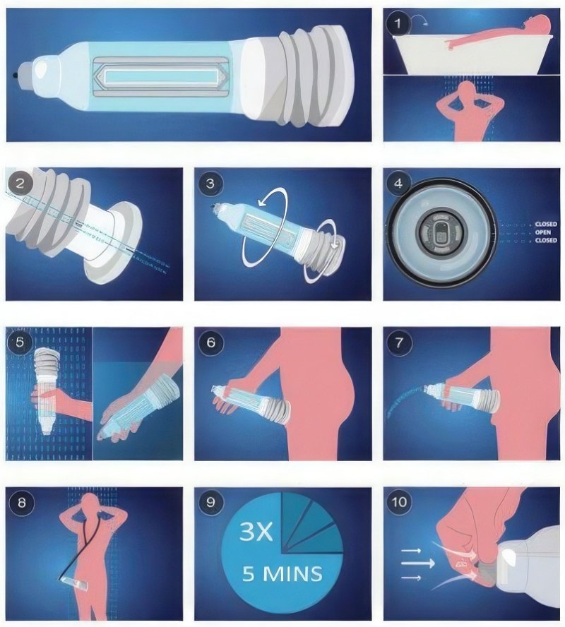 Ложимся в ванну, погружаем вакуумную помпу в воду, наполняем ее, затем засовываем пенис и надавливаем на помпу.