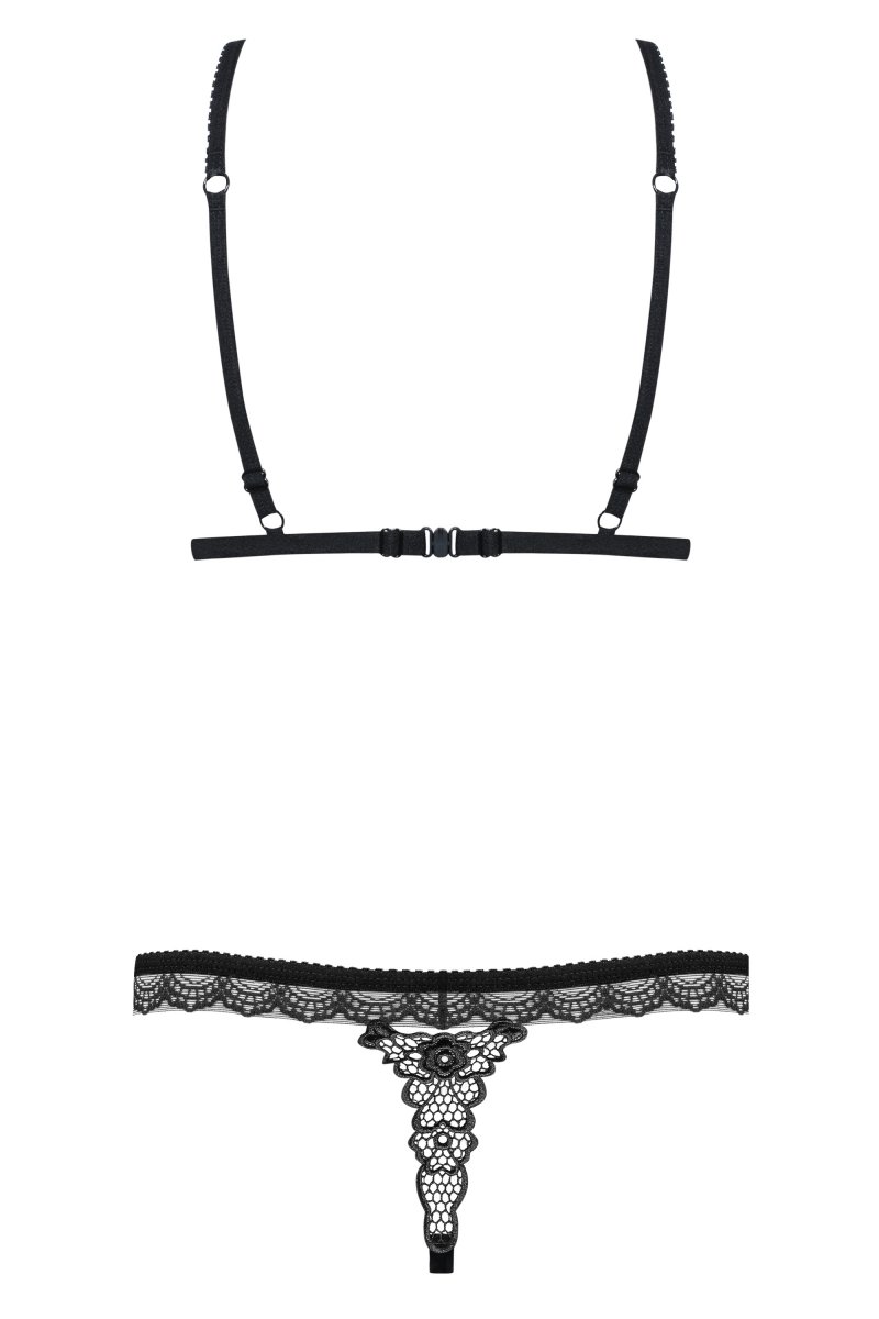 Детали: бюстгальтер с регулируемыми бретелями и застежкой - гарантия идеальной посадки, открытые чашки с уникальной кружевной вставкой - потрясающий вид бюста, необычный дизайн стрингов - смелый крой и перекрещенные резинки спереди, красивое кружево сзади, комплект декорирован бантами и мелкими ювелирными украшениями, приятные на ощупь, эластичные, идеально облегающие ткани.