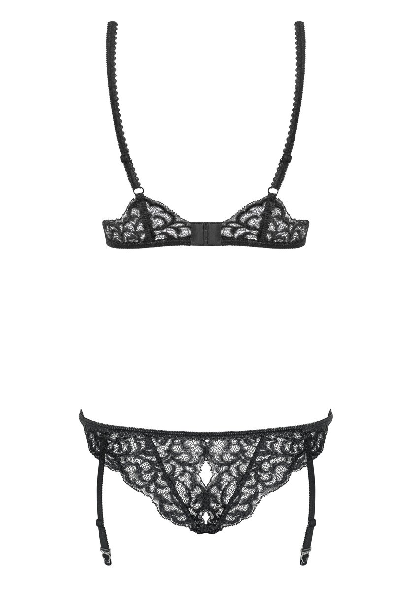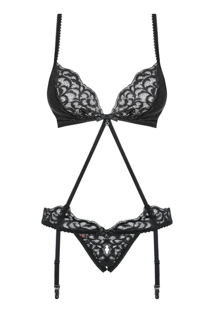 Детали: многоступенчатая застежка на спине и регулируемые бретельки - бюстгальтер подойдет идеально, материал на груди с блестящими частичками и кружевными вставками - красиво подчеркнутая грудь, ювелирные подвески с черными камнями и декоративными бантами - элегантные детали, два сексуальных ремешка, соединяющие верхнюю и нижнюю части, съемные бретели для чулок - больше возможностей, деликатная суперэластичная ткань Multistretch, открытая промежность и пикантные вырезы на ягодицах - будет жарко!