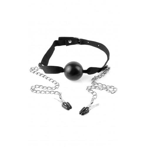 Набор состоит из кляпа в виде шарика черного цвета (диаметр – 4,7 см) и зажимов для сосков.