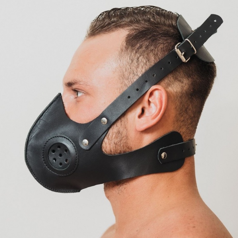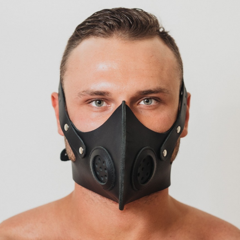 Маска из натуральной кожи черного цвета со вставками по бокам, напоминающими фильтры противогаза, придающие виду соответствующий антураж. Маска надежно фиксируется на голове, отлично подходит для продолжительных ролевых игр. Дерзкий дизайн поможет раскрыть все грани вашей роли в БДСМ игре.