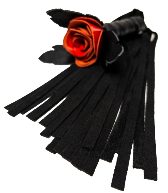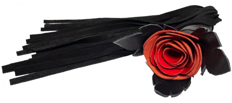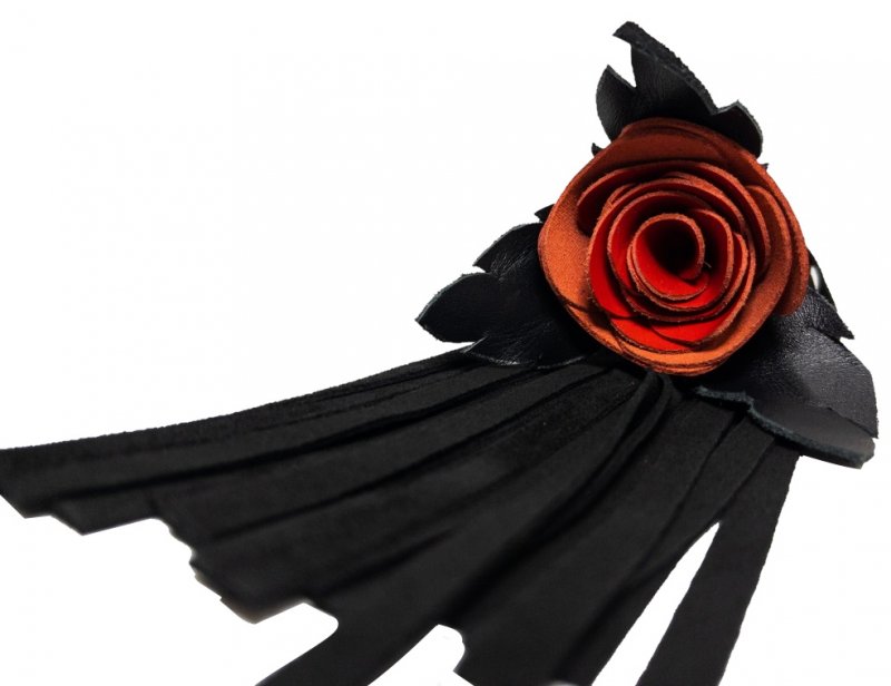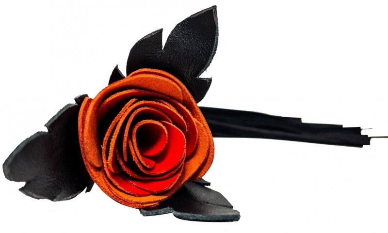 Цветок полностью выполнен из натуральной лаковой кожи, листочки розы и рукоятка выполнены из мягкой натуральной кожи, а хвосты плети - из натуральной мягкой замши.
