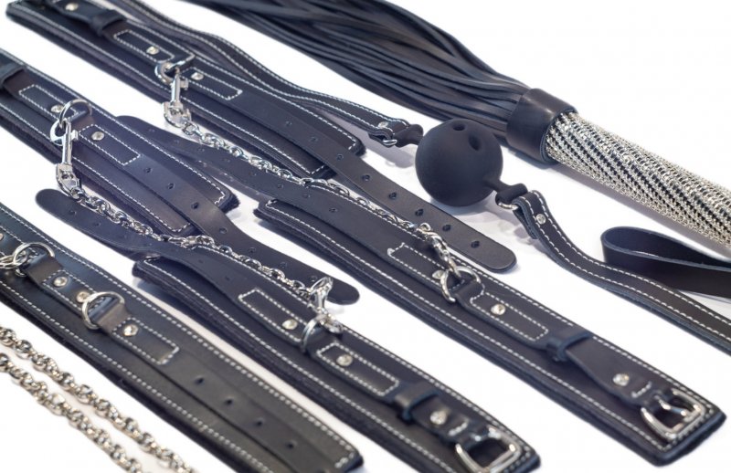 В набор входят: наручники, поножи, плеть, кляп, ошейник и поводок.