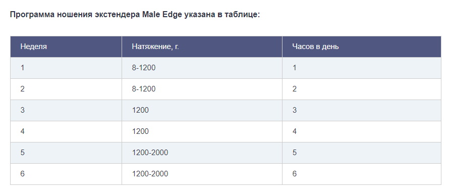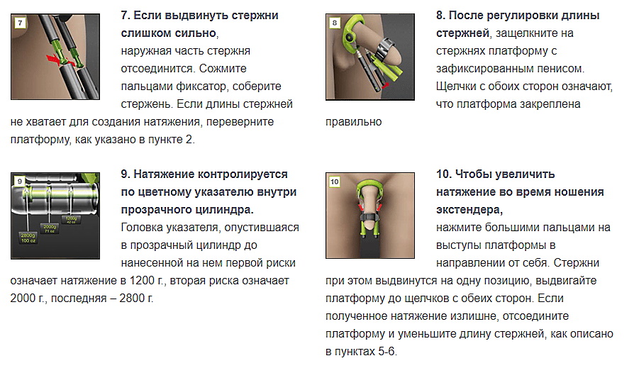 После 6 недели экстендер желательно носить не менее 6 часов в день, обычное время применения – около 6 месяцев, или пока не будет достигнут желаемый результат.