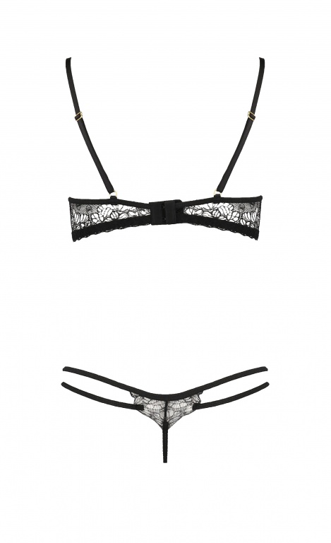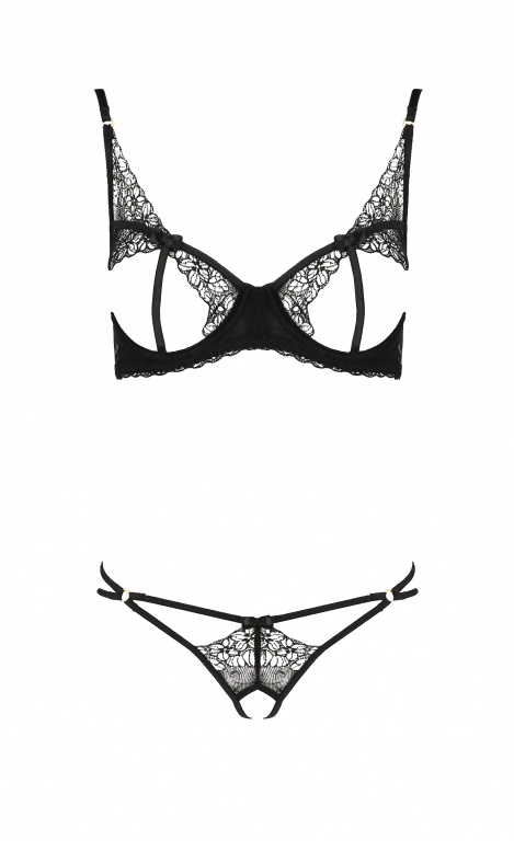 Эротический комплект белья Esmeralda состоит из открытого бюста на косточках и контактных стрингов.