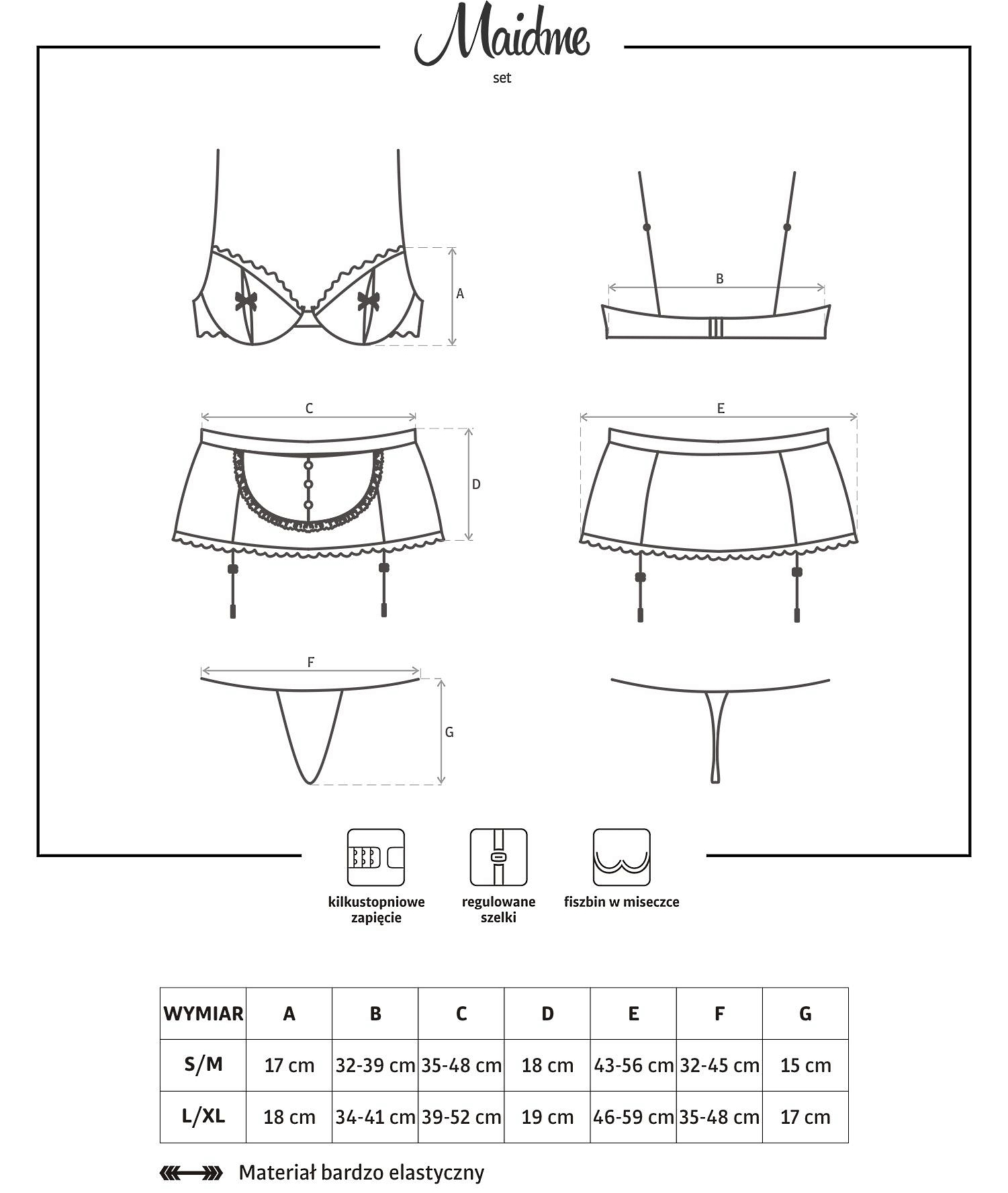 Широкий пояс для чулок выполнен в виде белого фартука и украшен глянцевыми пуговичками и атласным бантом. Так же есть пажи для чулок. Чепчик подчеркивает и завершает костюм.