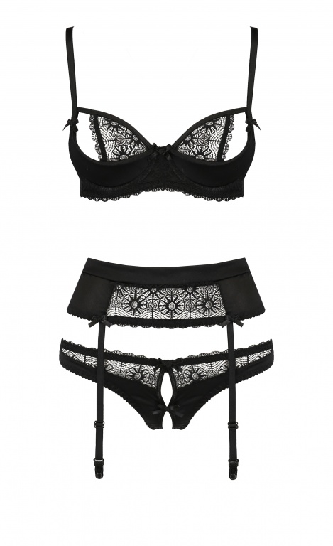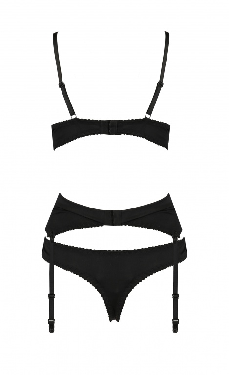 В комплект входит бюст с полуоткрытой чашкой на косточках, пояс для чулок и стринги.