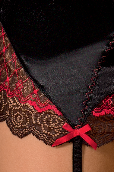 Состоит из сексуального открытого бюстгальтера, пояса для чулок с регулируемыми подвязками и трусиков.
